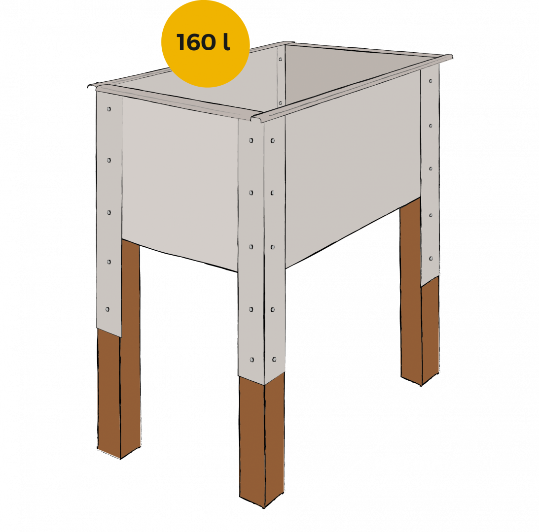 - Bausatz mit Boden und vier Seitenteilen aus 2 mm Stahlblech und vier stabilen Stelzen aus Fichten-Kantholz inkl. Montage-Set