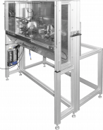 An dieser Prozesslinie werden Werkstücke vorbereitet und auf Gleitschienen manuell zu den einzelnen Stationen geschoben. Unter anderem werden auf einem Rundtisch Kleberaupen auf das Werkstück aufgetragen und an der nächsten Station unter UV-Licht ausgehärtet.